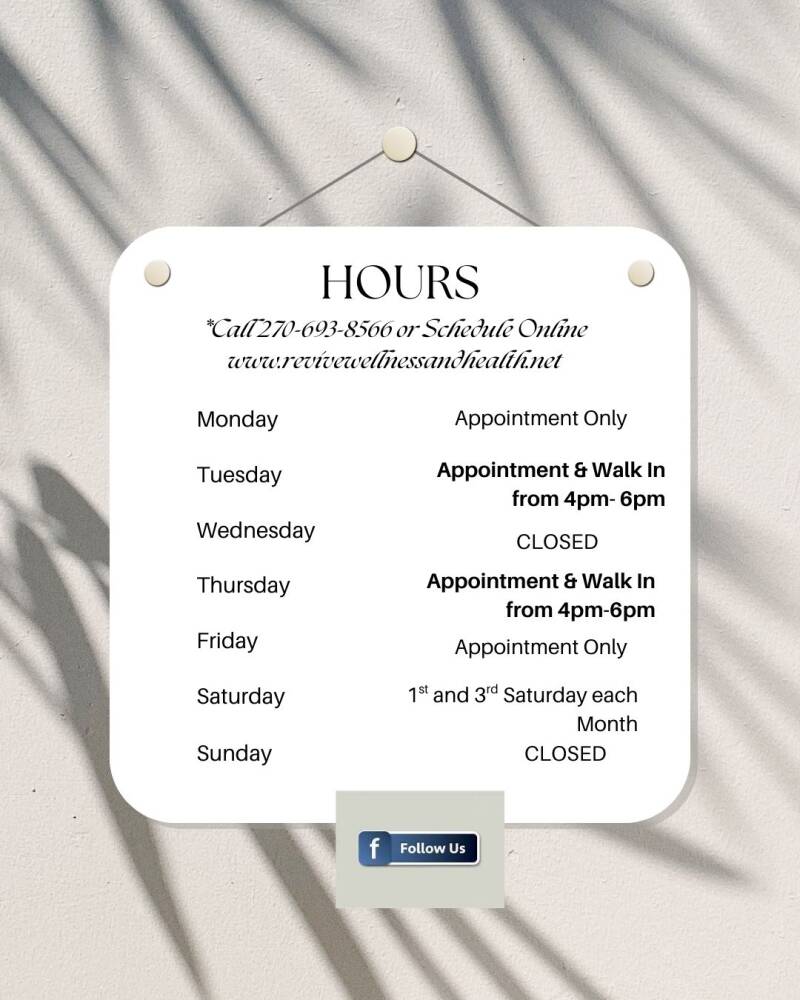 Revive Wellness and Health is based in Russellville, KY. Our mission is to empower individuals to improve their health and wellbeing. With a team of dedicated professionals, we are committed to helping our clients achieve their wellness goals and live their best lives.